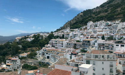 Jo nimensäkin perusteella Aurinkorannikko on auringonottajan paratiisi. Merenrantaa riittää silmänkantamattomiin ja kesäkuussa näytti rannoilla olevan mukavasti tilaakin. Aurinkotuolit auringonvarjon suojassa maksoivat meidän valitsemassamme paikassa viisi euroa päivältä. Itse rannalle oli vapaa pääsy. Mutta Aurinkorannikko ei ole vain merta ja aurinkoa, vaan se on myös korkeita kukkuloita ja kuvankauniita kyliä niiden rinteillä. Yksi näistä taajamista on Mijas, josta lähtee vaellusreittejä seuduille, joissa jo antiikin ajan roomalaiset ovat astelleet. Näiltä korkealla sijaitsevilta rinteiltä avautuvat huikeat näkymät alas rannan tuntumaan ja Mijas itsessäänkin on erittäin kaunis paikka ja todellakin kokemisen arvoinen. Halutessaan siellä saa kyytiä hevosella tai aasilla ja sitten autolla alas laskeutuessaan voi valita ns. maaseutureitin, jonka varrella saattaa hyvinkin nähdä vapaana laiduntavia hevosia.